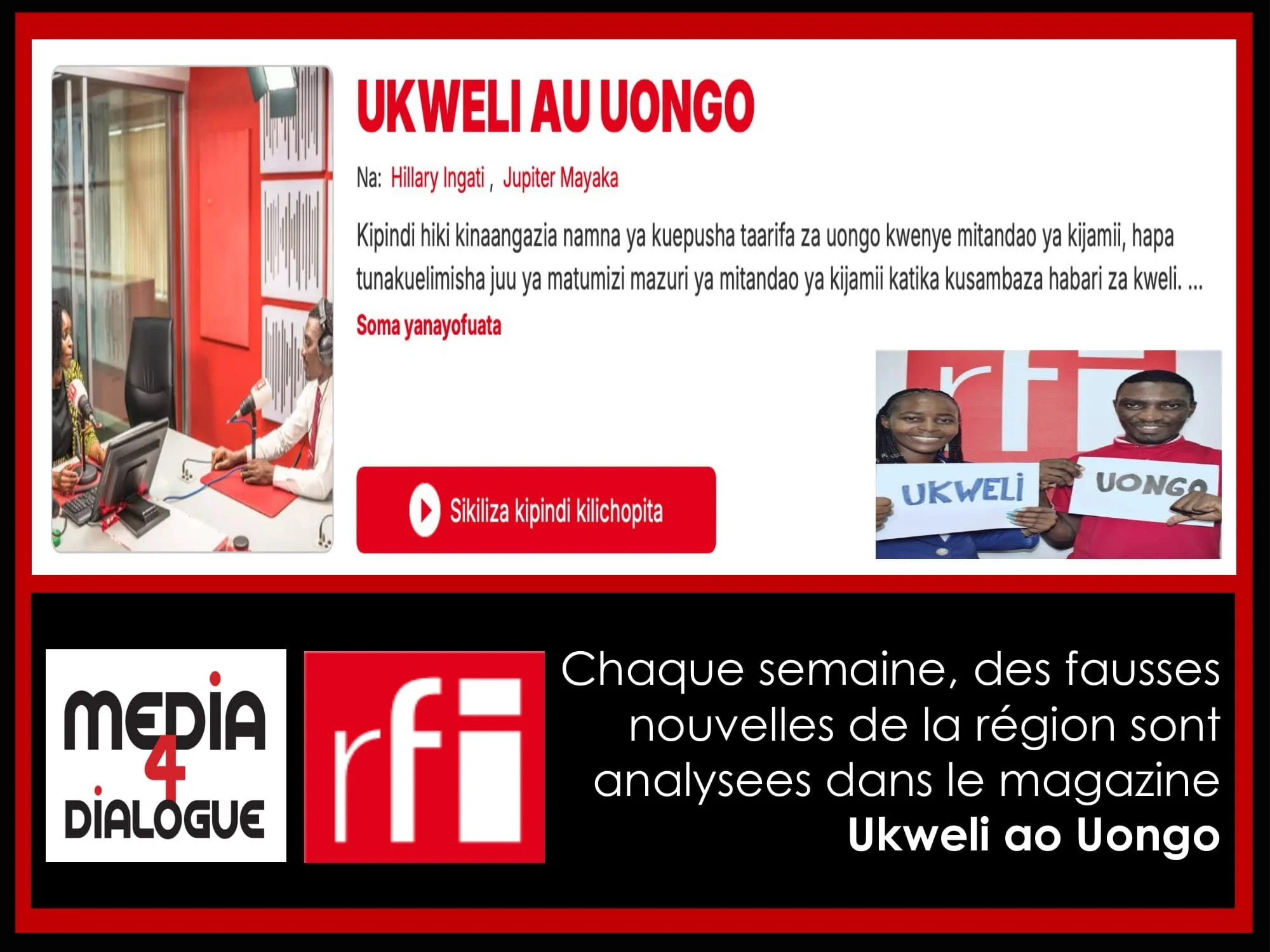 This week on M4D M4D latest Feb 1 Written By Susanne Schotanus This is an overview of the programs produced within Media 4 Dialogue (M4D) this week. Kumbuka KeshoMusekeweyaMurikira Ukuri Susanne Schotanus